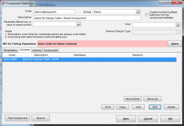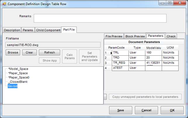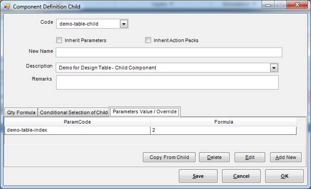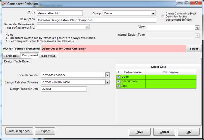 Design table based components are called from the parent components just like any other component. FormulaCAD finds the appropriate row depending on the value of local parameter for selection in the context of the component. Once this row is found, FormulaCAD looks up the row definition to either load a block from a file or move on to the child component defined in the row.