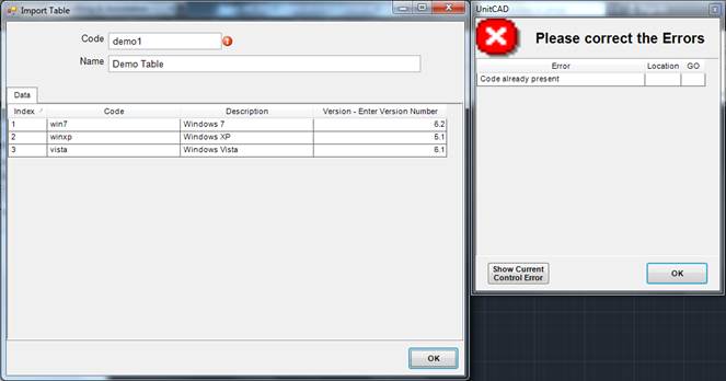You can save the table by pressing the OK button. However if the design table code is already present, an error dialog box will be displayed.