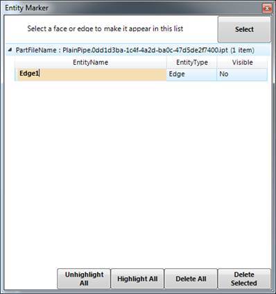 FormulaCAD provides an entity marker to name faces and edges. You invoke this utility from the ribbon bar and the above window is shown.