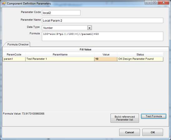 To use the formula checker, first type the formula in and then press the “Build referenced parameter list “button. FormulaCAD will then list the referred parameters in the box along with a Status column on whether this parameter was found among the list of parameters in scope.