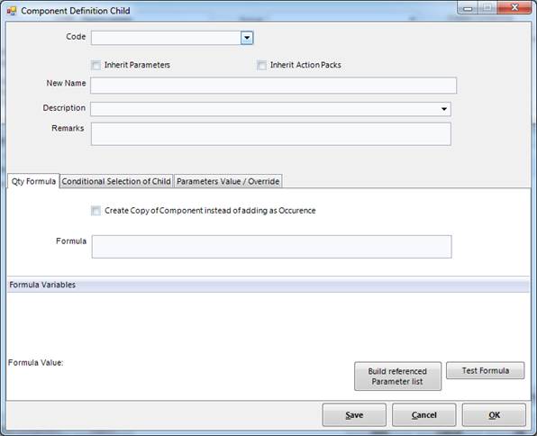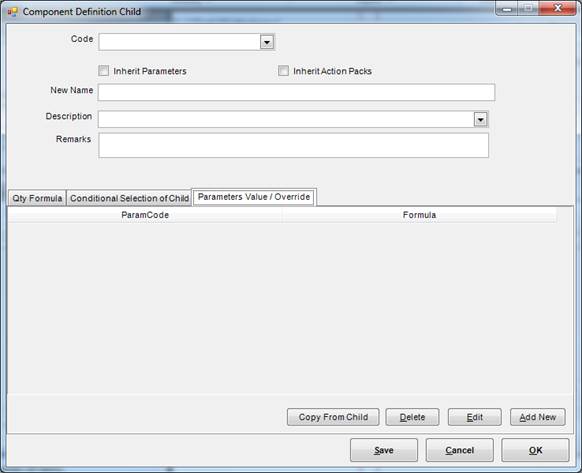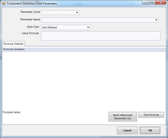 The Parameter code combo box lists all parameters for all components. This is essential because conditional selection of child is allowed. You need to select the code of the parameter to be overridden and then type in the formula. You can use the formula checker as usual.