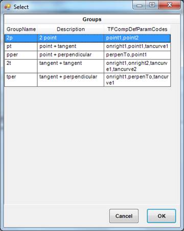 In case parameter groups have been defined (which you will see later in this section), you will be presented with a dialog box to choose which parameter group you wish to override and parameters belonging to the selected group will be copied. This is used by FormulaCAD internal components such as line, circle etc. to present appropriate variant to be created.