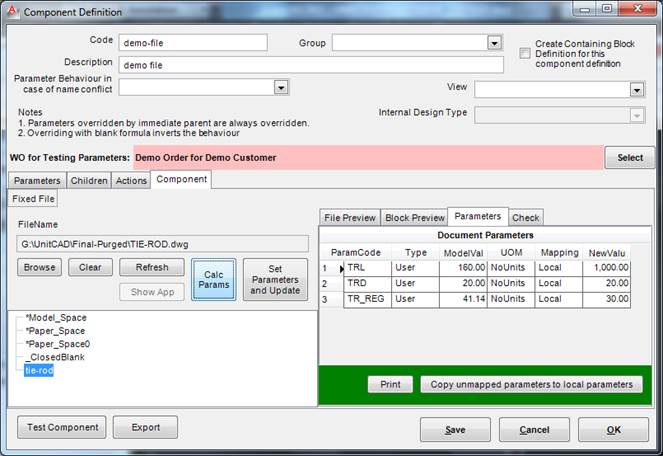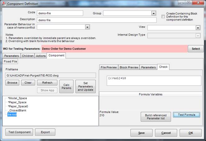 This formula tester is different from the others in the fact that the formula values are taken from the global parameters as defined for “WO for testing Parameters” and local parameters as defined in the component.