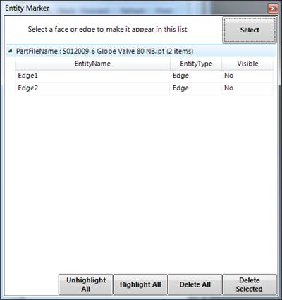 Entity marker allows you to view / edit / add /delete entities in a part or assembly file. As you can see in this screen, two edges have been defined in this part file. If you click on any entity in this list, FormulaCAD will highlight the same in the model.
