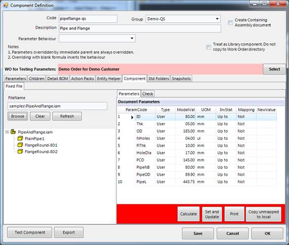 FormulaCAD maps parameters in the block with the parameters in the component definition. Red color at the bottom means all parameters have not been mapped.