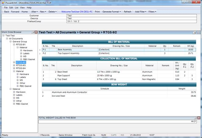Bill of Material for Work Order Document with Collection