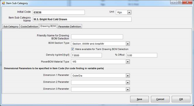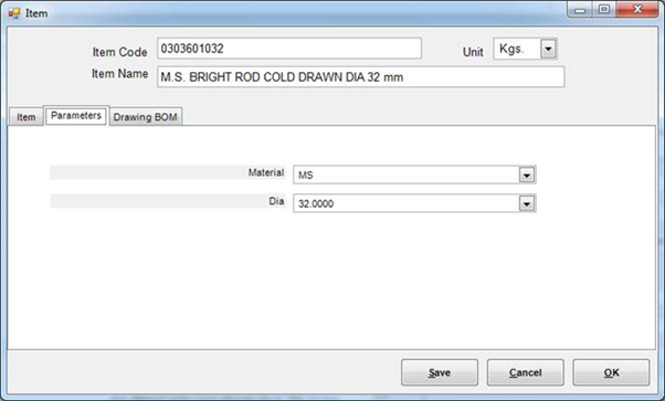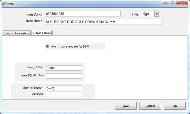 Material Section field is used by PowerBOM to generated specification for document BOM material. For example, for above item code, PowerBOM will generate “DIA 32 x 1000 Lg.” instead of “MS Bright Rod Cold Drawn Dia 32 mm x 1000 Lg.”