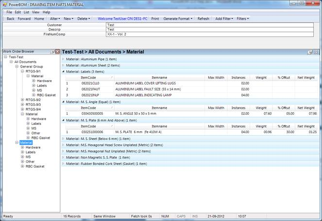 Bill of Material for Work Order Document