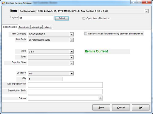 All read-only fields are populated from the control items database. If terminal information has been defined, the quantity is 1 and read-only, otherwise the quantity field is editable.