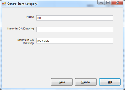 Apart from grouping the control items, you can also define the name and makes in customer GA drawing for the control items in this category. You can override the name and makes in the control item screen.