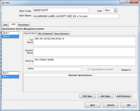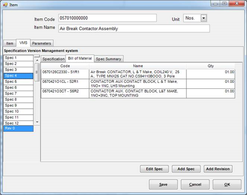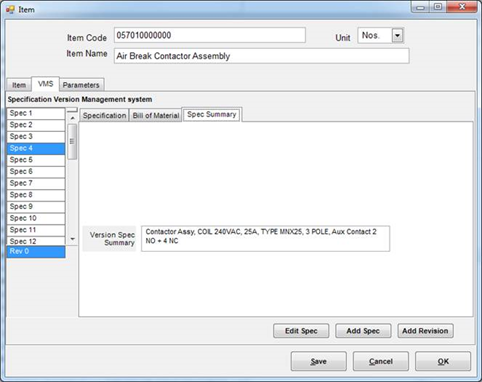 An item in VisualCircuit can have multiple specs and each spec can have multiple revisions. If you use the “Add Spec” button, the spec number will be increased and if you use the “Add Revision No.”, the revision number will be increased. This will be appended to the item code in the form SxRy where x is spec no. and y is rev no.